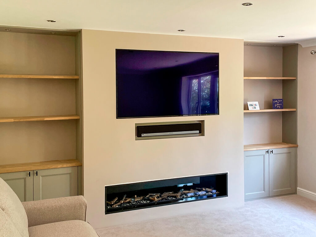 After we designed a false chimney breast, and some bespoke made cupboards with matching shelving, our design brought their fireplace media wall dream to reality.